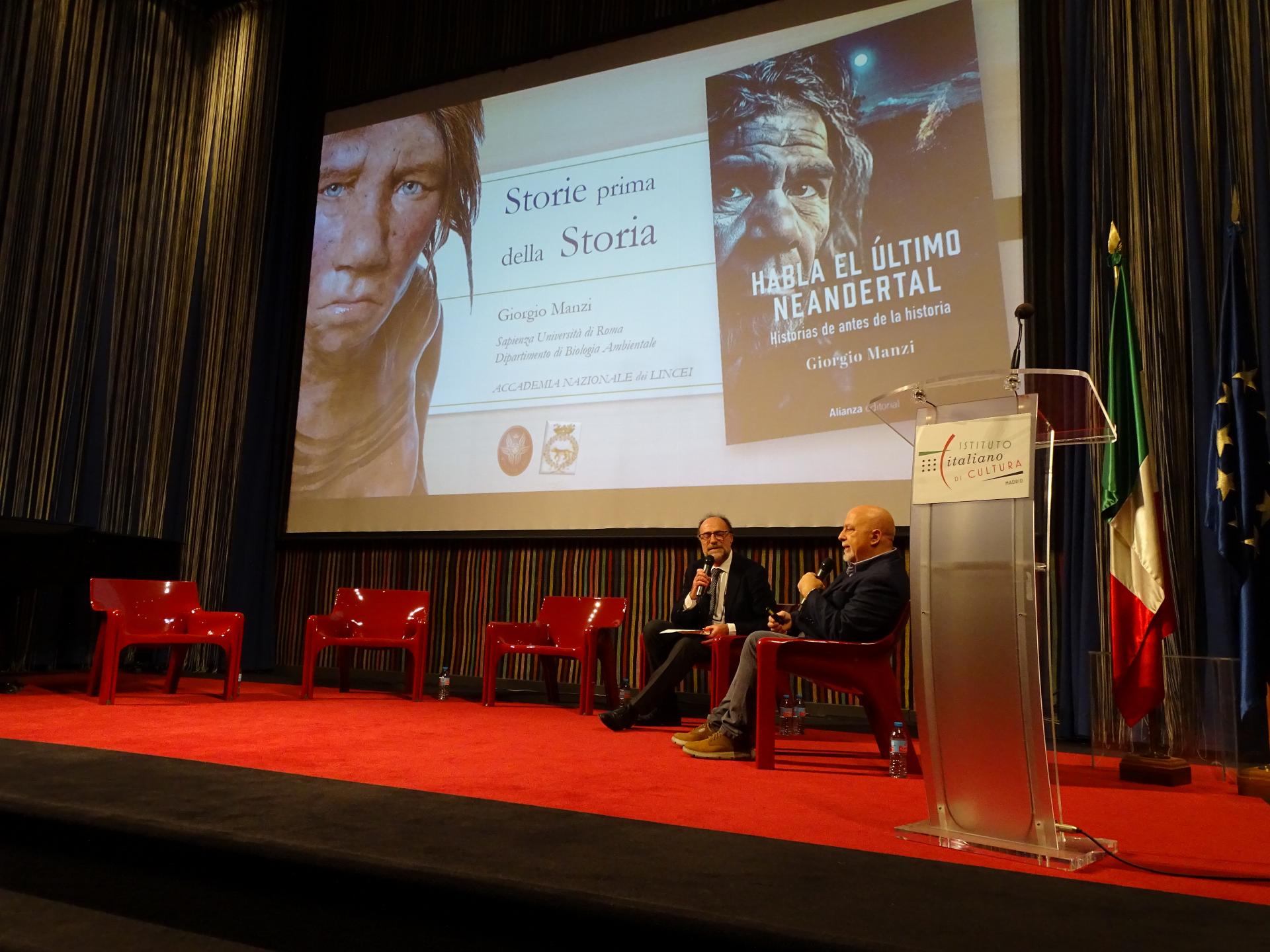 En la primera parte de la velada, el agregado científico de la Embajada, Sergio Scopetta, conversó con el profesor Giorgio Manzi, de la Universidad La Sapienza de Roma, investigador de renombre internacional, académico de la Accademia dei Lincei y autor de libros divulgativos traducidos también al español. En la conversación se abordaron algunos momentos fundamentales de la evolución de nuestra especie «Homo», como la extinción de la especie «Neanderthal». También se habló brevemente del efecto del cambio climático en la dieta de nuestros antepasados, dada la atención prestada recientemente a la educación y la sostenibilidad alimentaria, con motivo de la Semana de la Cocina Italiana en el Mundo.