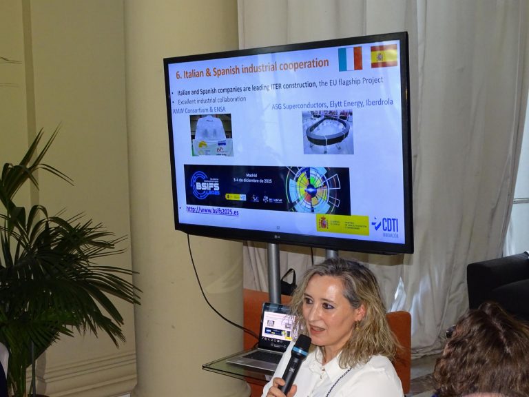 Sono intervenute, per ogni panel, personalità di grande rilievo scientifico e accademico. Inizialmente, Paola Batistoni, Responsabile del Settore Fusione dell’ENEA, Carlos Hidalgo, Direttore del Laboratorio Nazionale di Fusione del CIEMAT, Pedro Velarde, Professore alla Universidad Politécnica di Madrid, hanno descritto lo stato della ricerca nel campo, nei due paesi. Nel secondo panel sono stati descritti due grandi progetti internazionali, in costruzione in Italia e Spagna. Il consorzio DTT a Frascati è stato introdotto dal presidente Francesco Romanelli, mentre IFMIF-DONES a Granada è stato presentato dal direttore scientifico, Ángel Ibarra. I due progetti affrontano due sfide cruciali per i futuri impianti, quali l’impiego efficiente dell’enorme energia attesa dai futuri reattori e la caratterizzazione dei materiali che saranno impiegati. I relatori si sono trovati in forte accordo su un nuovo paradigma operativo, quello di includere l’industria fin dalla fase progettuale delle iniziative e non solo in quella realizzativa, per garantire la rapidità di esecuzione richiesta. Il ruolo dell’industria nei progetti è stato poi esemplificato da Francesca Ferrazza, responsabile dell’unità Magnetic Fusion Initiatives di ENI, azienda attiva a livello internazionale nella fusione nucleare in tutti i suoi aspetti, e Ana Belén del Cerro, Industrial Liaison Officer del “Centro per lo Sviluppo Tecnologico e Industriale (CDTI)”.